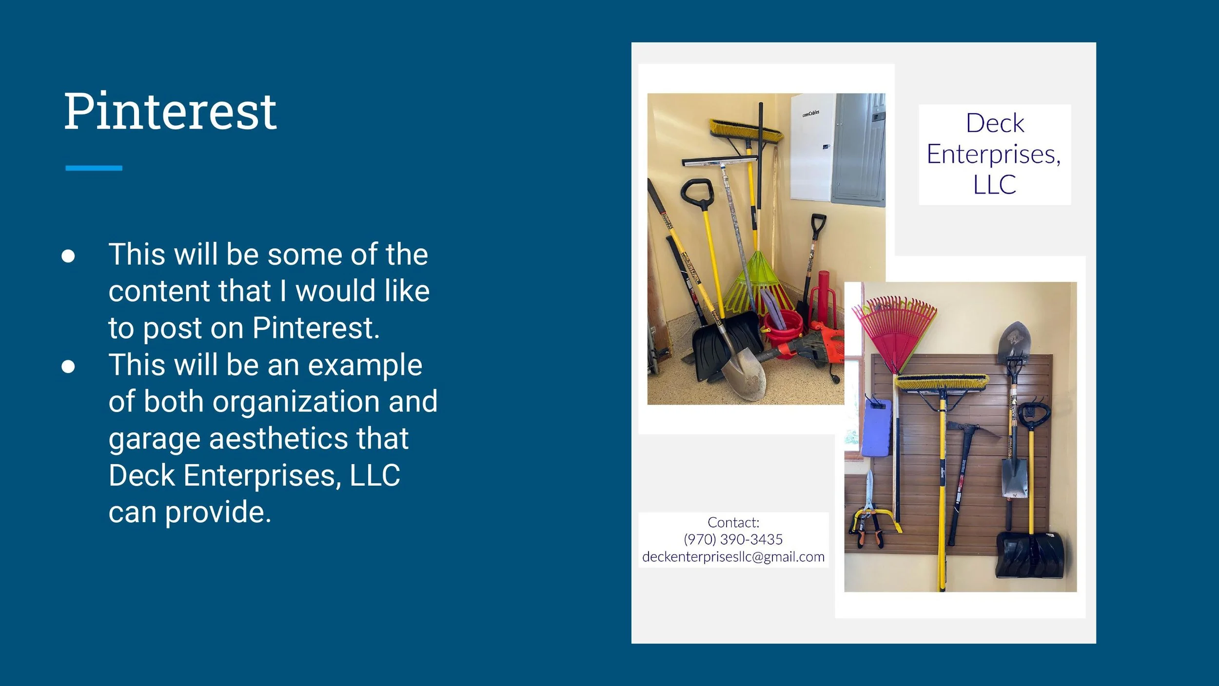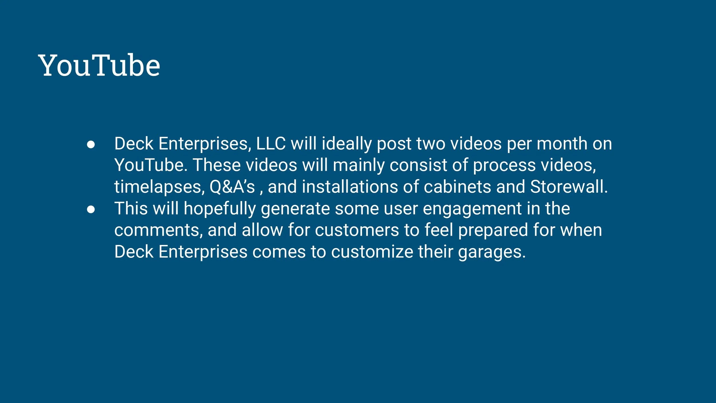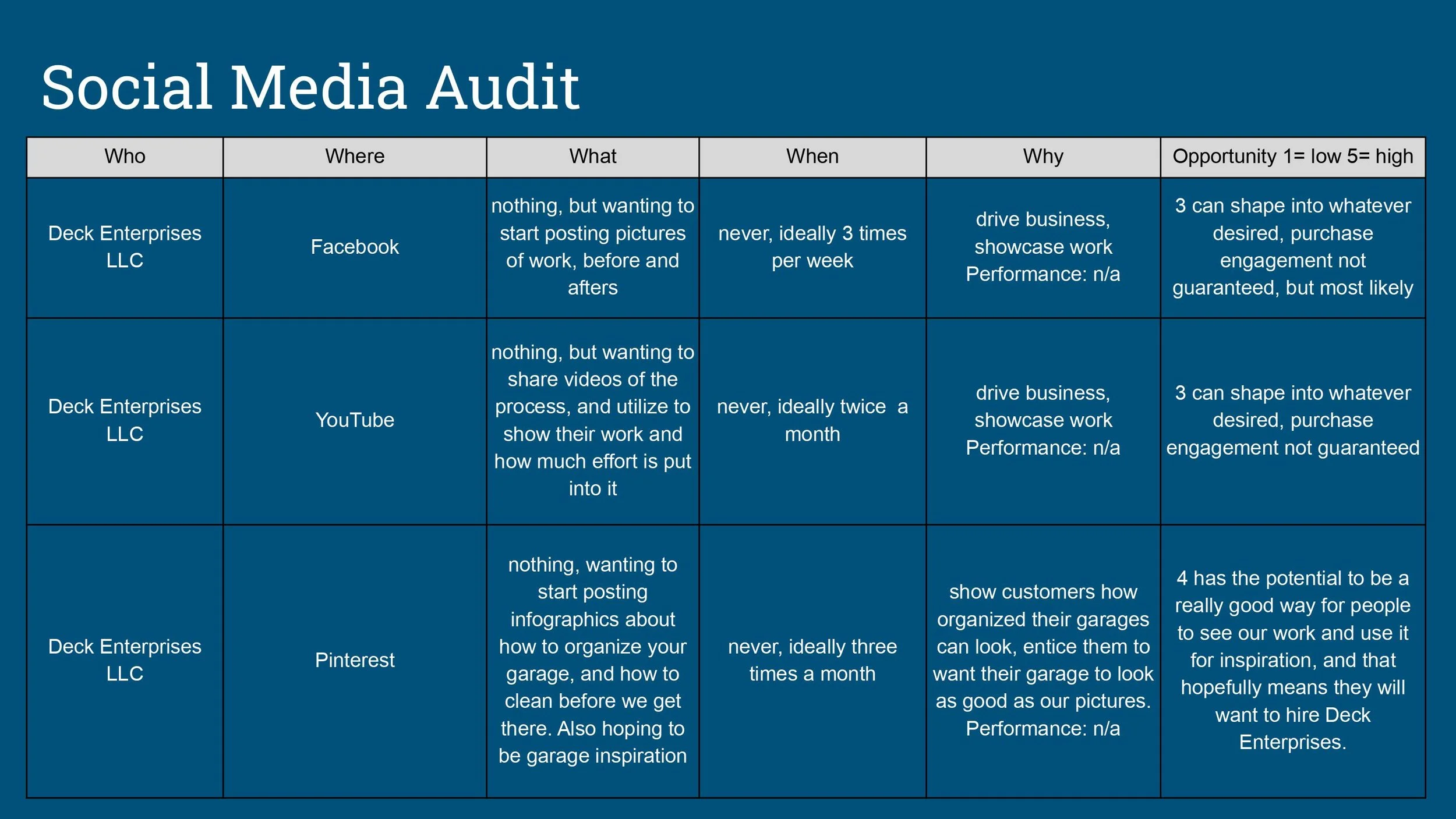 This is a complete presentation of my Social Media strategy plans for the company Deck Enterprises, LLC Slide 1 Slide 1 (current slide) Slide 2 Slide 2 (current slide) Slide 3 Slide 3 (current slide) Slide 4 Slide 4 (current slide) Slide 5 Slide 5 (current slide) Slide 6 Slide 6 (current slide) Slide 7 Slide 7 (current slide) Slide 8 Slide 8 (current slide) Slide 9 Slide 9 (current slide) Slide 10 Slide 10 (current slide) Slide 11 Slide 11 (current slide) Slide 12 Slide 12 (current slide) Slide 13 Slide 13 (current slide) Slide 14 Slide 14 (current slide) Slide 15 Slide 15 (current slide) Slide 16 Slide 16 (current slide) Slide 17 Slide 17 (current slide) Slide 18 Slide 18 (current slide) Slide 19 Slide 19 (current slide) Slide 20 Slide 20 (current slide) Slide 21 Slide 21 (current slide) Slide 22 Slide 22 (current slide) Slide 23 Slide 23 (current slide) Slide 24 Slide 24 (current slide) Slide 25 Slide 25 (current slide) Slide 26 Slide 26 (current slide) Slide 27 Slide 27 (current slide) Slide 28 Slide 28 (current slide) Slide 29 Slide 29 (current slide) Slide 30 Slide 30 (current slide) Slide 31 Slide 31 (current slide) Slide 32 Slide 32 (current slide) Slide 33 Slide 33 (current slide) Slide 34 Slide 34 (current slide) Slide 35 Slide 35 (current slide)